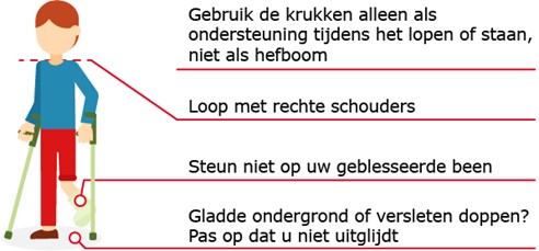 -Als je met twee krukken loopt, let er dan op dat deze op gelijke hoogte zijn ingesteld.