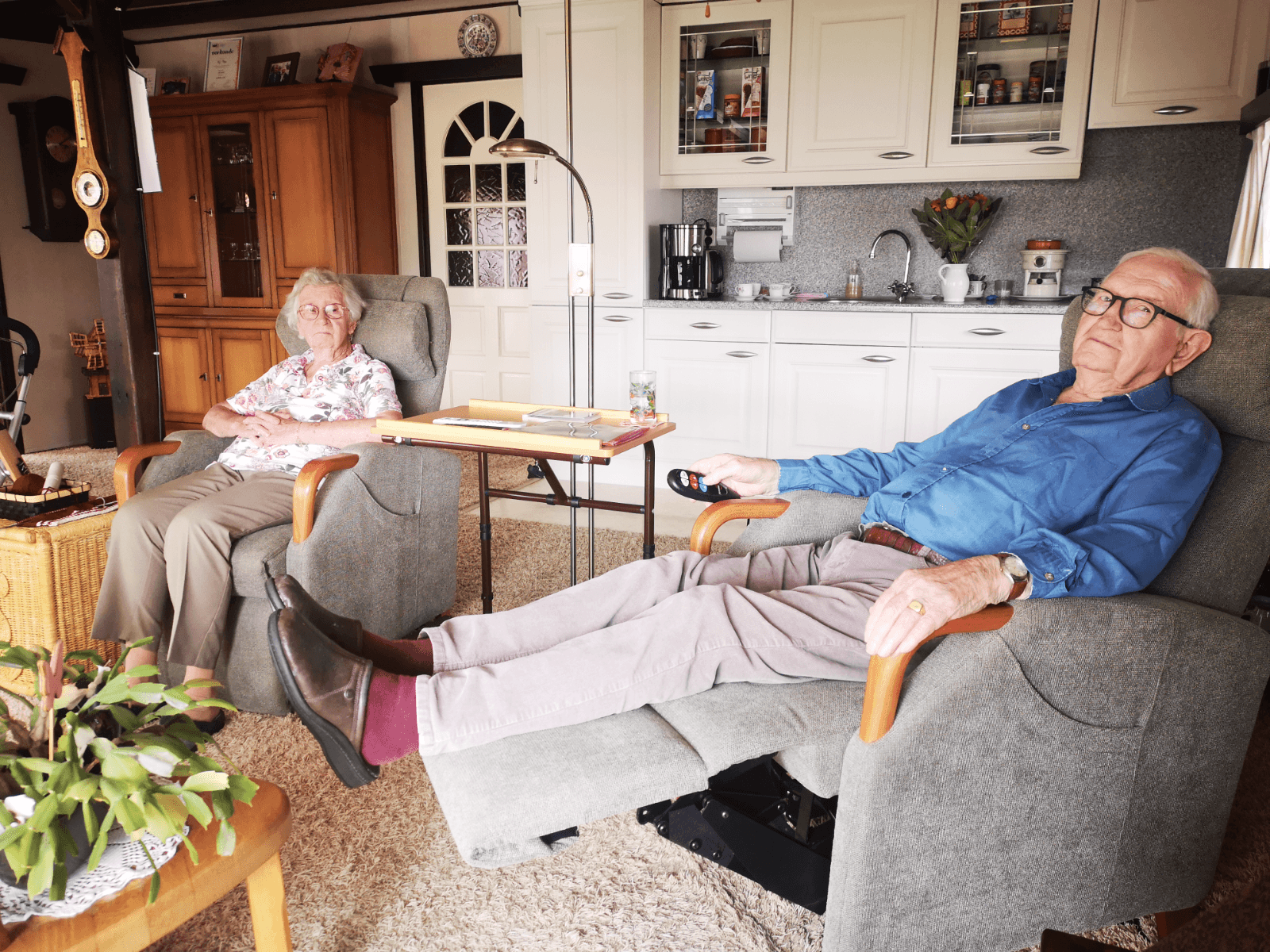 We krijgen heerlijke koffie van versgemalen bonen, vlekkeloos geserveerd vanaf de binnenrollator. Ook het schoteltje met chocolade ontbreekt niet. Het echtpaar Floor oogt vrolijk, ze zijn al 72 jaar samen. De luxe fauteuils staan prominent in de woonkamer. Aan de muur verschillende oorkondes. Dat de ene stoel iets kleiner is dan de ander, valt niet meteen op. “Die grote stoel konden we zo meenemen, dat is het model uit de winkel. En deze is speciaal op mijn maat gemaakt. Helemaal opgemeten zodat ik er perfect in zit,” legt mevrouw Floor uit. “We kijken vanuit onze stoelen graag naar het damesvoetbal en genieten van de Tour de France.”